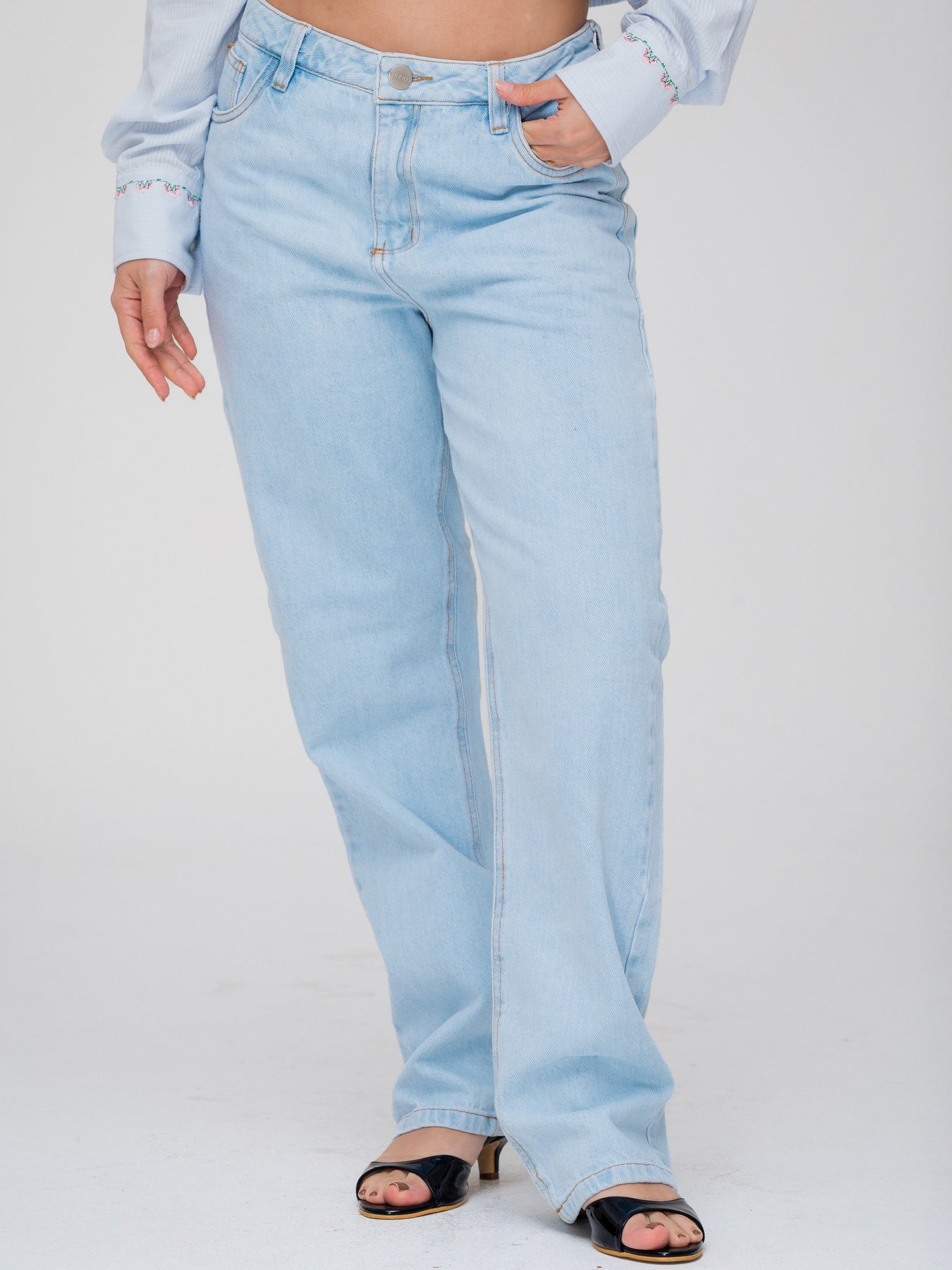 Pantalón fabricado en Denim rígido, su diseño incluye dos bolsillos delanteros tipo redondeado a la cadera y dos bolsillos traseros tipo carpintero con botón Sophie de 30 líneas en zamac y cierre de cobre.