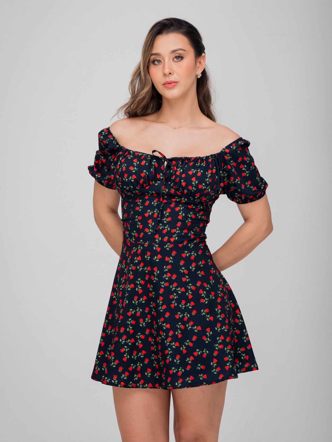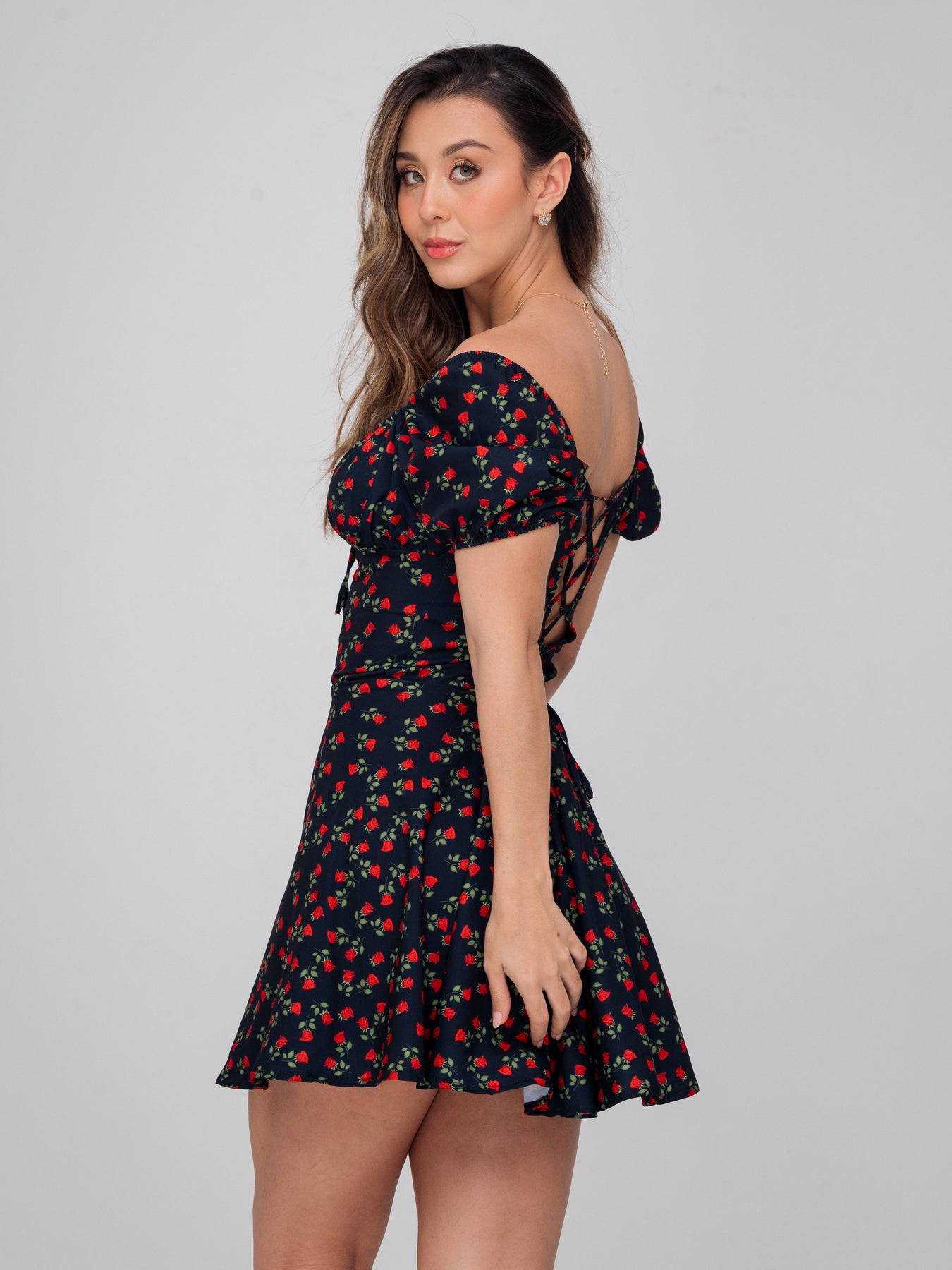 Vestido fabricado en seda mango sublimada, su diseño incluye dos tiras en el busto para su ajuste, tiene un sistema de ajuste para la espalda y cintura por medio de un trenzado tipo corset.